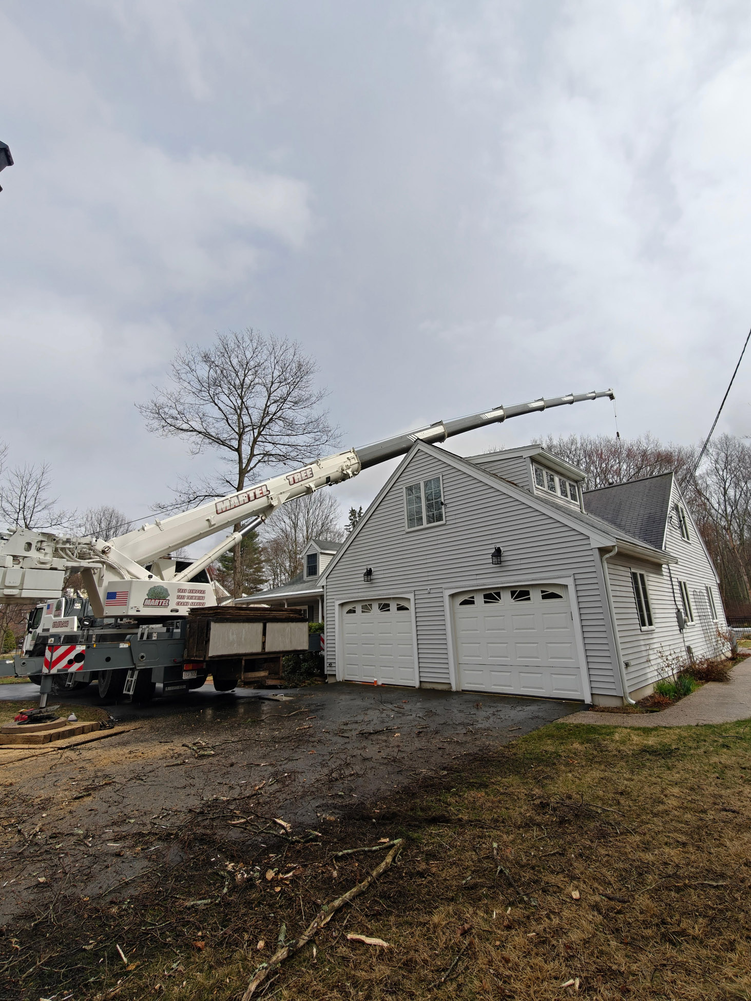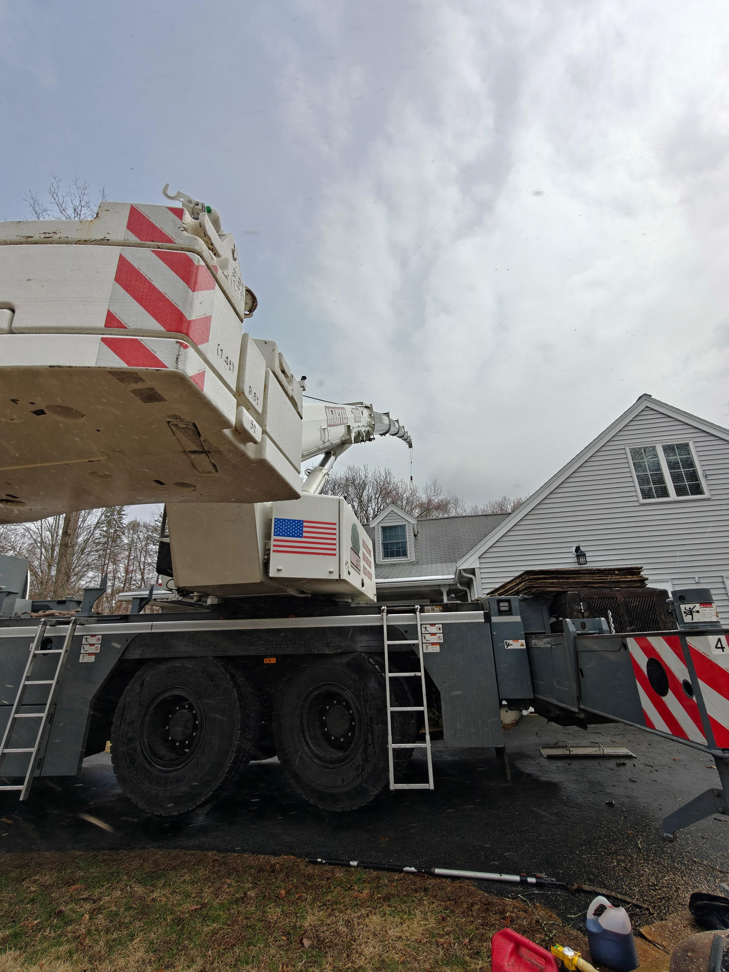 For this removal, our crew utilized the 110-ton Liebherr crane to safely handle a tall tree positioned close to the home. With the crane extended over the roofline, we were able to remove sections with precision while protecting the structure, driveway, and surrounding property.